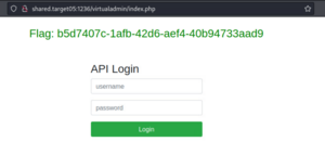 When you get your username correctly you will get the login credential Username: administrator Password: terminator008 UserID: 1 IP: 127.0.0.1 Documentroot: /virtualadmin You can go after that with your browser http://shared.target05:1236/virtualadmin/ and you will find login page. When you enter earlier credentials on it you get the flag.
