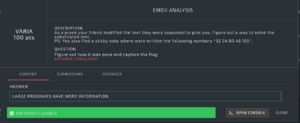 I replaced all the emoticons with letters. Since some of the characters were already given I had to make sure that none of the smileys were replaced by previous characters. Next, I put the text into the frequency analysis program and started to change the characters, trying to see if the text would be somehow clearer. After a while of rotating the letters I got the right ones replaced and the text became readable.