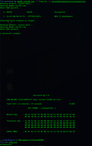 Download the .cap file and run aircrack-ng wpa01.cap-01.cap -l flag.txt -w /usr/share/wordlist/rockyou.txt to get the code. Then just read flag.txt file.