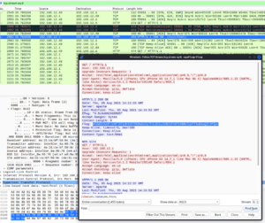 Then I just start to browse through packets and start with tcp streams. Using "Follow TCP stream" I just did go through streams one by one until I found something interestin. In stream 6 was http answer where was flag base64 encoded. So I decoded that and found that you have to encode it again. Until that I got the flag.