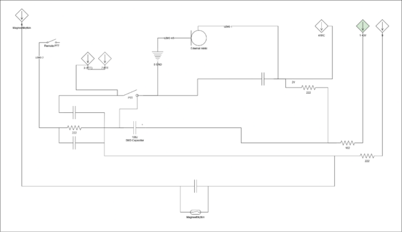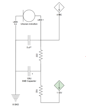 Todennäköisesti mikrofonipiiri sisältää low pass filtterin. Kuitenkaan en ole mitannut kondensaattoreiden kokoa. Tein kuitenkin simulaation 10uF ja 5uF vaihtoehdoilla, joissa 5uF komponentilla 1kHz taajuudella alenema on -31dBV ja 10uF kondensaattorilla 1kHz alenema on -40dBV. Itse mikrofoni kuulokkeen päässä mittautuu 1.9KΩ resistanssilla, joten voi olla että siinä on etuvastus sensitiivisyyden vähentämiseksi tai tuplamikrofoni taustamelun vähennykseksi, kuten jossain ohjekirjoissakin luki. [viite]