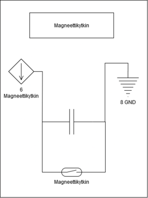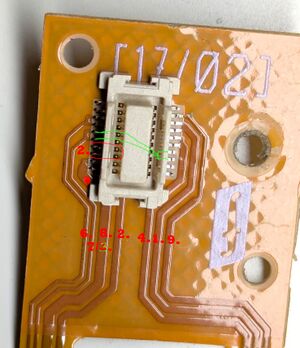 Johtimien yhteys piirilevylle. Johdin 8. GND kulkee molemmilla puolilla piirilevyä punaisella merkityn via:n läpi. Vihreällä merkattu ydistää kosketuspinnat 7:n ja 3:n toisiinsa. Kuitenkin PTT toimii vain liitinpinnan 7 läpi. Kts kuva.